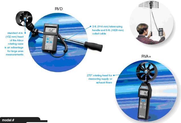 旋轉(zhuǎn)葉片風(fēng)速計可測量真實空氣速度,讀物無需進行密度校正因子修正。 RVA+ 的用戶可通過按單側(cè)按鈕并對被測量區(qū)域進行“掃描”而獲得面積平均流量。 RVD 提供了伸長測量以及數(shù)據(jù)記錄、調(diào)用和下載功能。