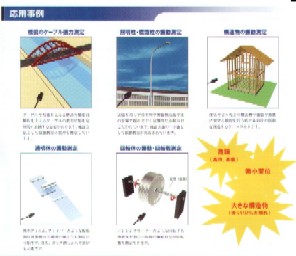 斜拉橋纜索、電桿或照明柱、車輛經(jīng)過時橋梁振動狀況、比常規(guī)探頭還小的電子零件微小振動測定、機(jī)械振動、住宅和建筑物測量(同時測定縱擺動及橫擺動)