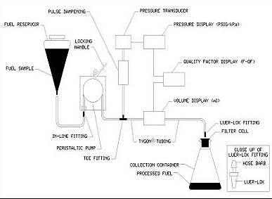 試樣以一定的速率(20 mL/min)通過標(biāo)準(zhǔn)多孔過濾器,同時測定通過過濾器的壓降和濾液體積。當(dāng)通過過濾器的壓降超過105 kPa (15 psi)或已過濾300 mL試樣時,測試即可結(jié)束,并顯示最終壓力和體積。使用最終壓力和體積,可以計算得出第三個實驗結(jié)果——過濾品質(zhì)因子(F-QF)——并數(shù)字顯示該結(jié)果。F-QF數(shù)值從0到100,數(shù)值越高表示微粒污染物越少。