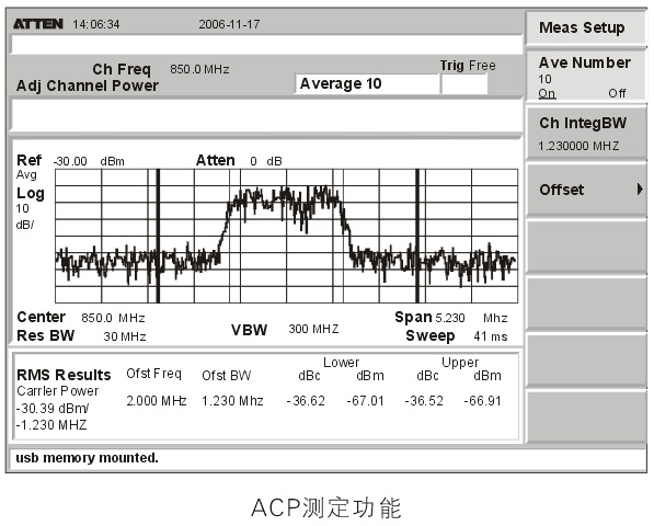 ·相鄰頻道功率(ACP)測試:是測試在使用多重頻道的移動通信系統(tǒng)上的傳送電力對相鄰頻道所起到的影響或者與相鄰頻道之間的電力比率??梢栽谝粋€屏幕上查看所有測試值以及波形。