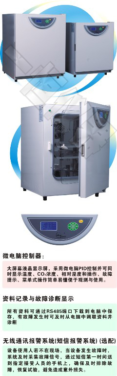 大屏幕液晶顯示屏,采用微電腦PID控制并可同時顯示溫度、CO2濃度、相對濕度和操作、故障提示、菜單式操作簡單易懂便于觀測與使用。