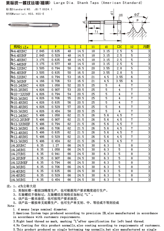 美制統(tǒng)一螺紋絲錐(粗柄)