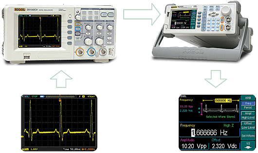 DS1000CA與RIGOL DG系列函數(shù)/任意波形發(fā)生器可以實(shí)現(xiàn)無縫互連。通過USB接口,DG系列函數(shù)/任意波形發(fā)生器可以直接訪問DS1000CA的波形內(nèi)存,并再現(xiàn)波形,方便對(duì)瞬態(tài)信號(hào)的進(jìn)一步研究。