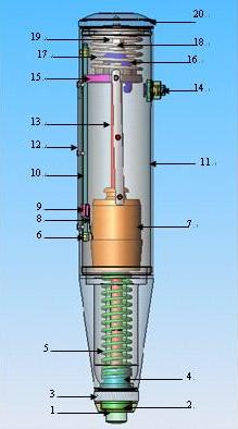 1.彈擊桿 2.卡環(huán) 3.蓋冒 4.彈簧座 5.彈擊拉簧 6.固定塊 7.沖擊錘 8彈簧片 9.指針滑塊 10.指針軸 11.儀殼 12.刻度尺 13.中心導桿 14.按鈕 15.導向法蘭 16.掛鉤 17.壓力彈簧 18.調整螺栓 19.調整螺母 20.尾蓋
