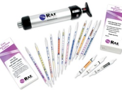 RAE檢測(cè)管,典型的是10支一盒,每個(gè)盒子背面都有試管簡介。有些試管使用時(shí)需要配有前置管,因而一盒中有5支處理管和5支測(cè)試管,可用于5次測(cè)量。試管上印有測(cè)量刻度,因此必須確保氣體按箭頭方向進(jìn)入試管。試管上還標(biāo)有100ml氣體標(biāo)準(zhǔn)刻度,采樣體積數(shù),測(cè)量單位和氣體型號(hào)。
