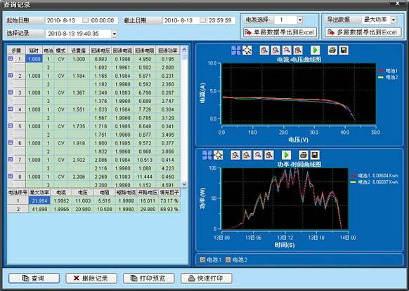- 測(cè)試界面實(shí)時(shí)顯示I-V曲線(xiàn),最大功率點(diǎn)24小時(shí)區(qū)間內(nèi)的P-T曲線(xiàn);查詢(xún)界面可顯示任意區(qū)間段內(nèi)的P-T曲線(xiàn),不受時(shí)間限制。