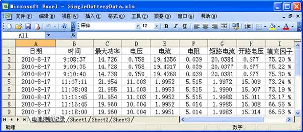- 可自動(dòng)測(cè)量出:最大輸出功率Pmax;最大功率時(shí)的電流值Ipmax,電壓值Vpmax,電阻值Rpmax;短路電流Ishort;開(kāi)路電壓Vopen;填充因子FF;電池的串聯(lián)電阻Rs以及并聯(lián)電阻Rsh。